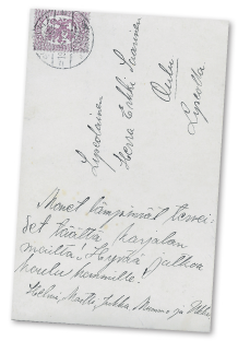 Sortavalassa syyskuussa 1925 leimattu kortti on osoitettu ”Lyseolainen Herra Erkki Saariselle” Oulun lyseolle, jostain syystä ei kotiin. Lähettäjä on hänen Helmi-sisarensa ja allekirjoittajina silloin kolmihenkisen perheen lisäksi Helmin puolison, jaakkimalaisen Jukka Mustosen vanhemmat, kortin mukaan kutsumanimiltään ”Mummo ja Ukko”. Kuvakortti ei kuitenkaan Kortti olikin Jaakkimasta! esitä Sortavalan katukuvaa tai rakennuksia, vaan maalaismaisemaa, joka tuskin on Sortavalan kaupunkia.
