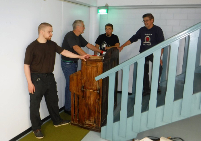Muuttotalkooväki on siirtämässä Lumivaaran kirkon urkuharmoonia uudelle paikalleen. Kaik hyö on karjalapoikii! (KMR)
